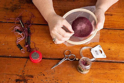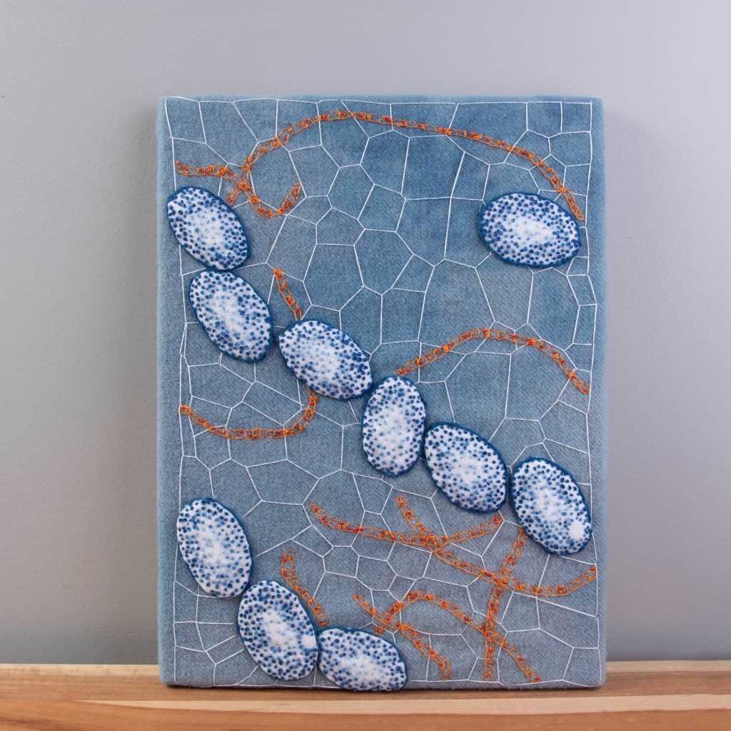 Connie has also been experimenting with abstract art and cell life. On a chosen background, often wool, she stitches shapes and patterns, using various techniques to create organic designs. They lend themselves well to being customized. Then there are sonograms done in embroidery. These are, of course, customized. They are the perfect gift for an expectant mother.