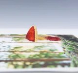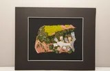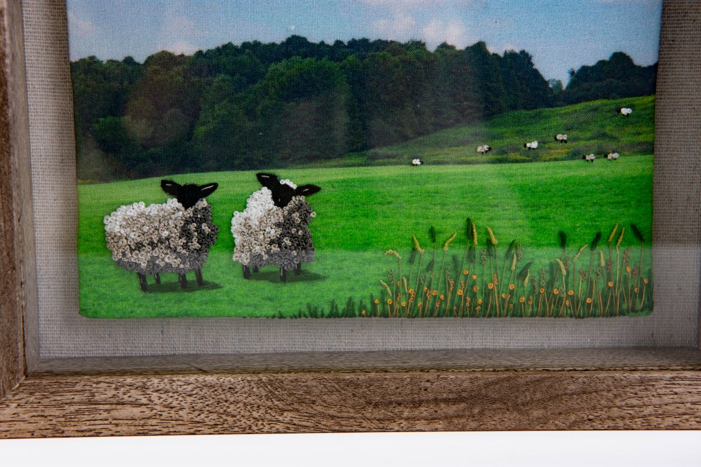 Connie uses her photographs as backgrounds for her needlework. She embellishes the photo with cotton, silk, or wool threads. She enhances the photo by layering, and strategically choosing points within her photographs that allow for dimension and depth. One that is loved by all is the 3D landscape “Daisies on Blue Mountain Lake.” (pic). The foreground daisies have a texture that draws the eye and are balanced against the mountains in the background. The boldness of the dark mountains plays off the lively daisies. She plays with color and depth in these textured landscapes. Her “Sheep Herd” piece is another example that plays with texture while being playful. It reveals two chubby and fluffy sheep. They stand in the foreground while several sheep are intimated as tufts of white in the background. Viewing these works of art in person is preferable, given the minute details.