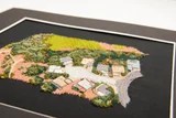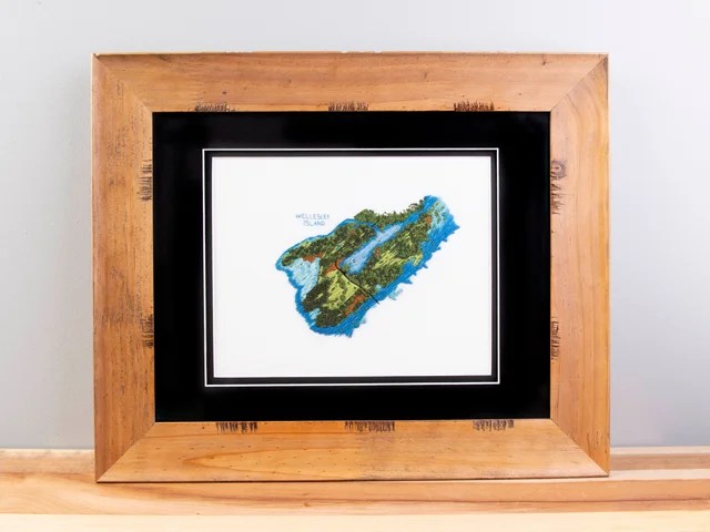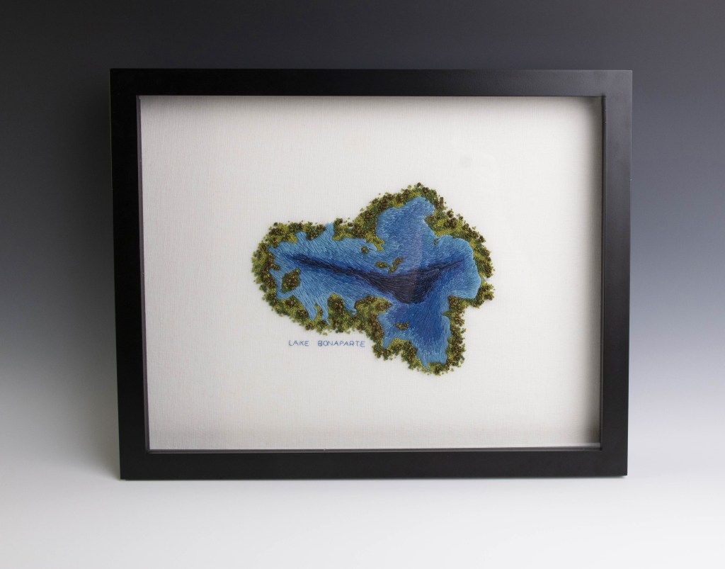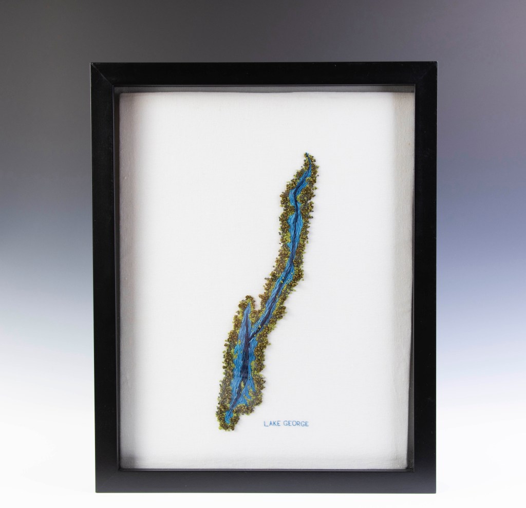 Most of her base layers consist of linen, wool, silk, cotton, and felt, upon which she builds her surface embroidery. Some of the designs look like aerial maps of Adirondack bodies of water. She works her stitches into water flowing or swirling, creating waves or rapids. Not only does she subtly blend the threads to suggest movement, but she also creates height and depth. Trees are tufts of greens, yellows, and browns. Some are captured in the fall and capture the vivid Adirondack oranges and reds. Some of her maps are so precise they look like a Google Earth satellite image!