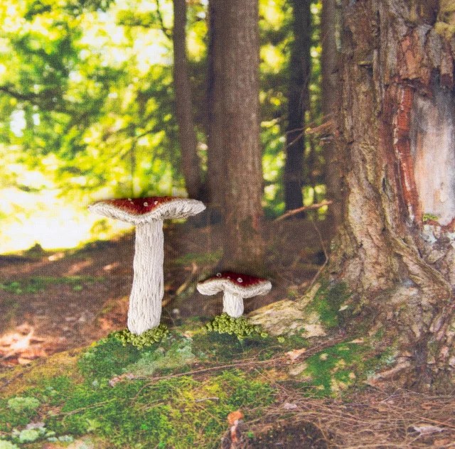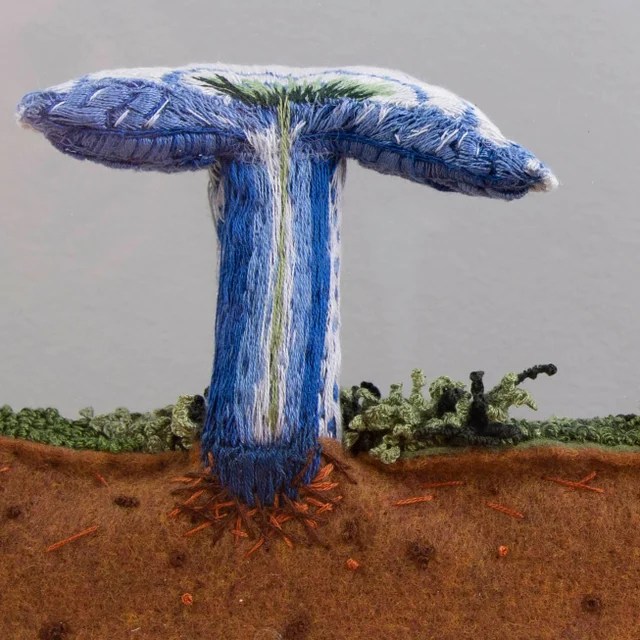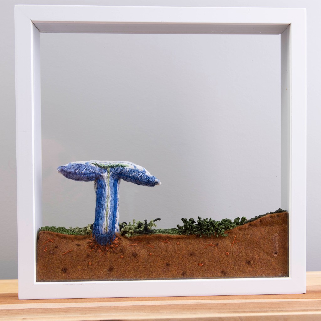 Connie listens to audiobooks as she works her needle, She says. “It takes many hours to create one mushroom or flower. Then it takes many more hours to stitch the supporting pieces. The backgrounds or bases are then made to compliment and show each piece in a unique, one-of-a-kind way.” And they are unique. She uses a dimensional embroidery technique called “stumpwork,” which originated in the 17th century. She uses a floor stand to hold her embroidery hoop or frame. This helps her create the tiny details that make it so realistic. This often involves using various stitches and materials to add depth and texture. Besides the 3D creations of moths, butterflies, and flowers, some of her 3D mushroom creations appear both forward and backward-facing. This orientation allows an internal view of the mushroom. They should line the walls of botanical classrooms.